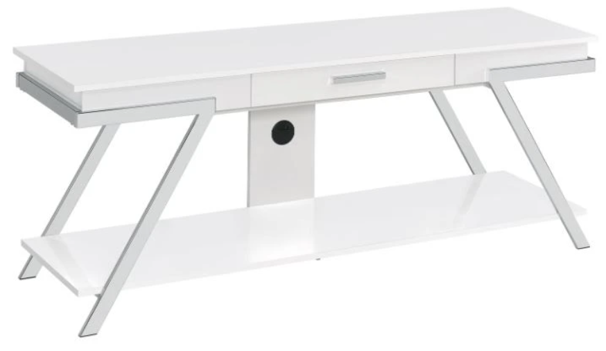 Designed for a contemporary living space, Zena TV Stand holds and frames your living room electronics in style. This chrome framed unit offers a neutral accent with a white finish. Midcentury modern style is highlighted by the canted legs framed in chrome glam, while a spacious drawer offers functional hidden storage.Read More